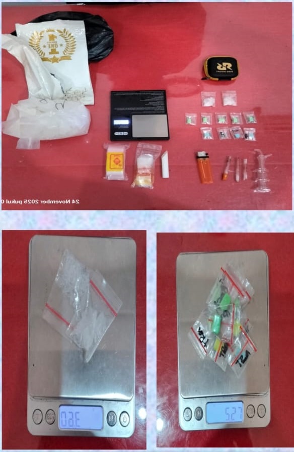 Dilanjutkannya dari hasil penggeledahan terhadap badan dan dirumah pelaku, petugas menyita sejumlah barang bukti berupa 2 plastik klip berisi serbuk kristal putih yang diduga narkotika jenis sabu dengan berat total 3,60 gram Brutto, 9 butir ekstasi dengan rincian 5 butir pil warna hijau muda dan 4 butir pil warna hijau kombinasi biru dengan berat total 5,27 gram Brutto, 1 unit timbangan digital, 1 buah bong alat hisap sabu, 1 satu pipet sendok sabu, 3 potong kaca fanbo serta 1 unit sepeda motor merk Honda Scoopy.