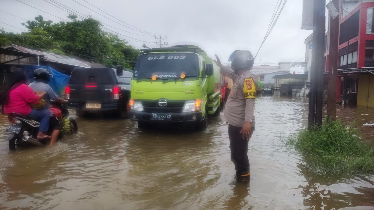 Ketapang, Polda Kalbar — Akibat luapan air pasang laut (banjir rob) yang menggenangi ruas Jalan Pawan 1, Desa Baru, Kecamatan Benua Kayong, Kabupaten Ketapang, Bhabinkamtibmas Desa Baru, Bripka Hidayat bergerak cepat memberikan Pelayanan Kepada masyarakat melaksanakan pengaturan arus lalu lintas serta membantu warga yang terdampak banjir tersebut, senin 08 Desember 2025.