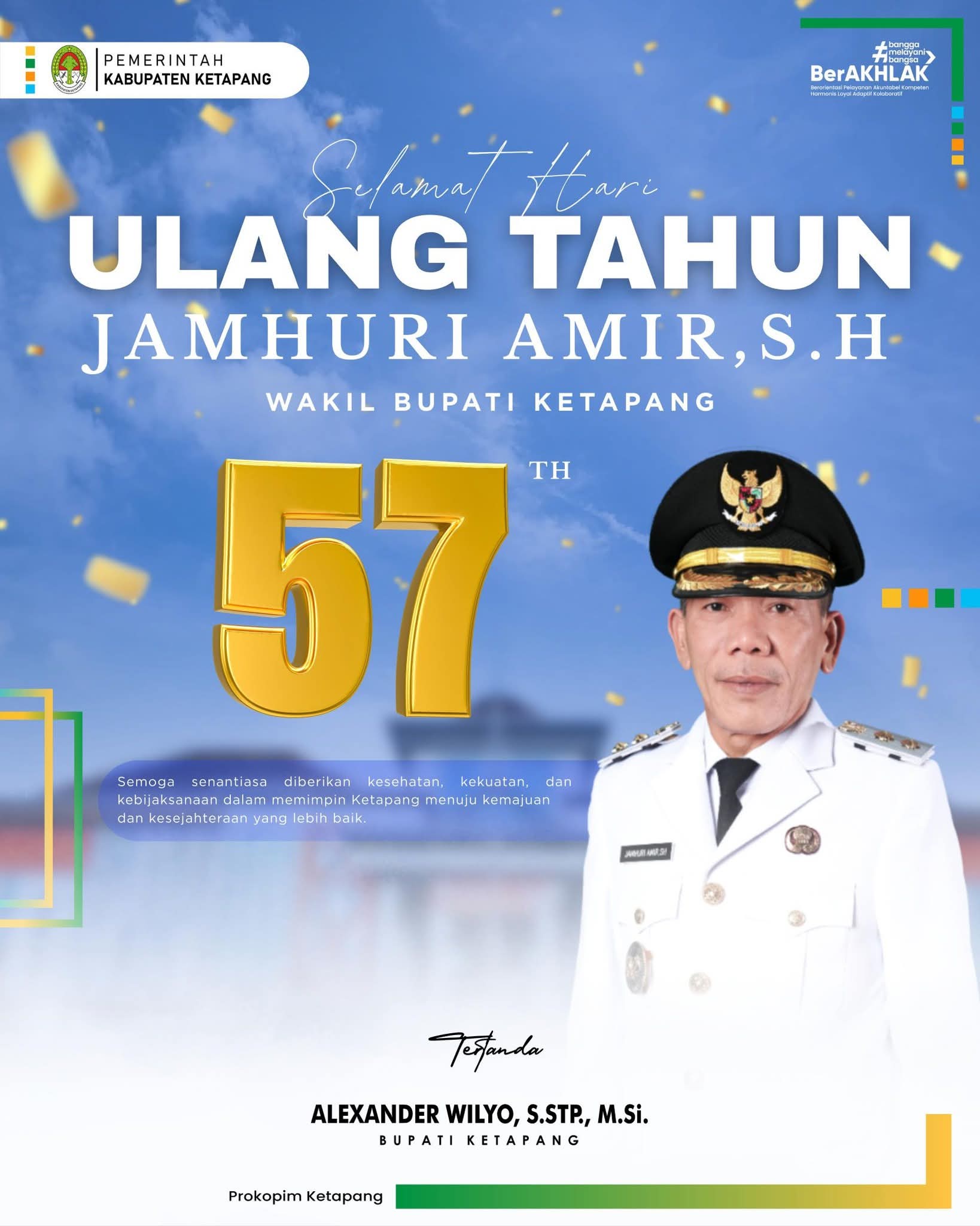 “Selamat ulang tahun yang ke-57 kepada Bapak Jamhuri Amir, S.H., Wakil Bupati Ketapang. Terima kasih atas dedikasi dan sinergi luar biasa dalam membangun daerah tercinta,” ujar Bupati Ketapang.