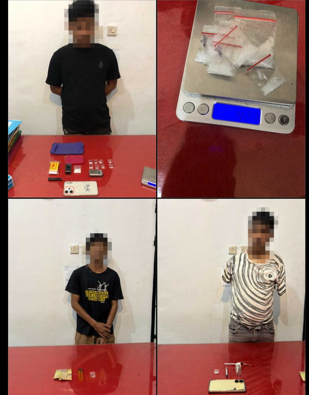“ Dari informasi yang disampaikan warga, kami langsung melakukan penyelidikan dilapangan dan benar saja, saat pelaku MF ini kita amankan, turut juga kita temukan dari tangan pelaku sejumlah barang bukti berupa 9 kantong klip transparan kecil berisi serbuk kristal diduga narkotika jenis sabu dengan berat total 4,23 gram brutto, 2 buah timbangan digital, 1 buah pipet modifikasi sendok sabu, 2 buah dompet serta 1 buah handphone ” Ujar IPTU Dewa Made Surita.