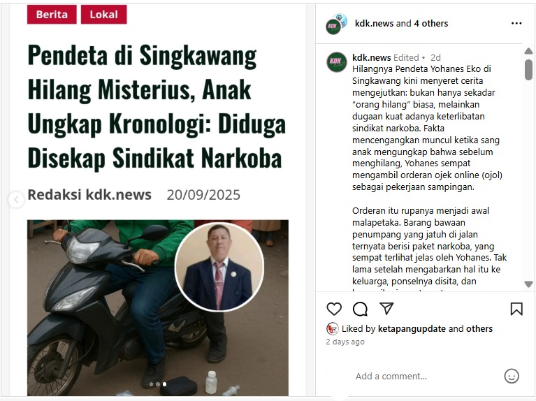 Kapolres Ketapang AKBP Muhammad Harris S.H., S.I.K., M.I,K., CPHR melalui Plt Kasi Humas IPTU Niptah menjelaskan, bahwa orang yang di anggap hilang ini Adalah salah satu Pendeta asal singkawang dan keluarga korban lansung membuat Laporan Kehilangan di Polres Singkawang, setelah hasil penelusuran kepolisian mengungkapkan bahwa orang yang sebelumnya dikabarkan hilang ternyata dengan sengaja membuat skenario seolah-olah dirinya menghilang dikarenakan diduga di sekap sindikat narkoba.