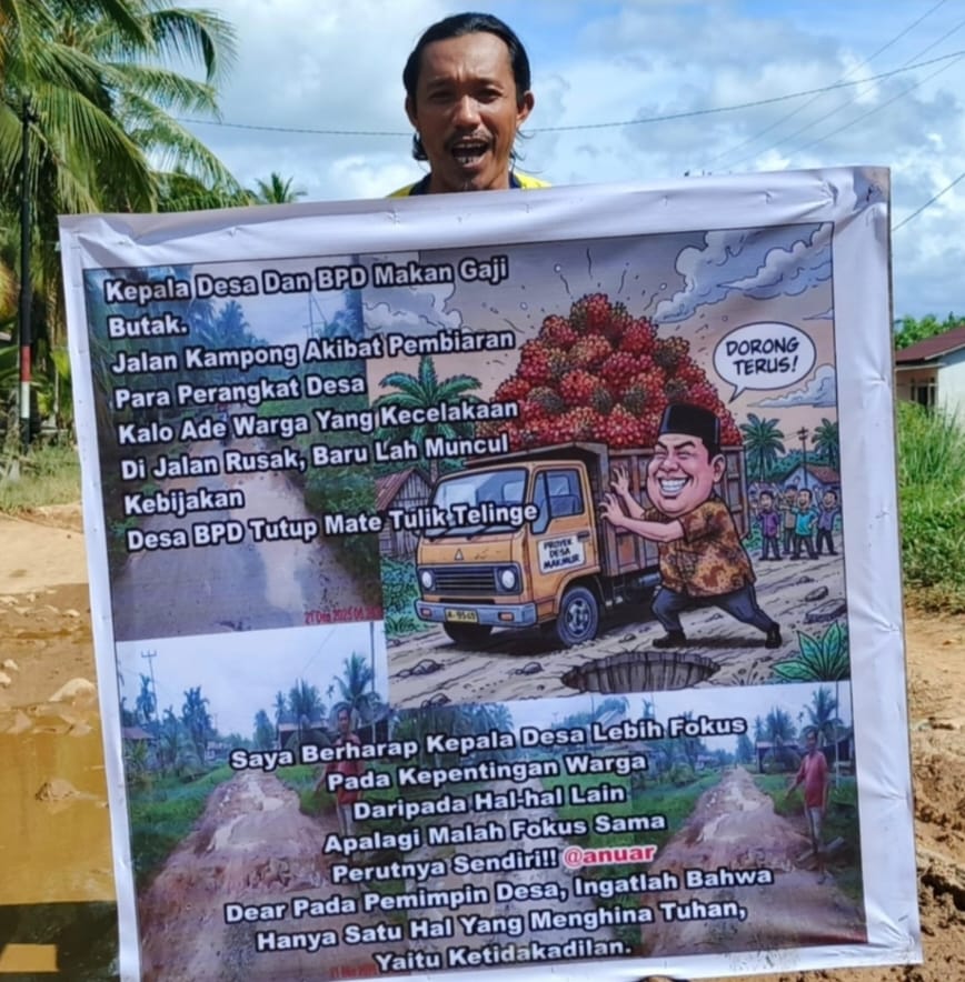 Warga berharap Kepala Desa lebih fokus pada kepentingan masyarakat dibanding hal-hal lain, bahkan menyatakan kekhawatiran jika pihak desa justru fokus pada kepentingan pribadi. Pada bagian akhir tulisan, disampaikan pesan bahwa “hanya satu hal yang menghina Tuhan, yaitu ketidakadilan”. Kondisi jalan yang terlihat pada foto di spanduk menunjukkan permukaan tanah yang berlubang dan bergenangan air, memperparah akses bagi warga.