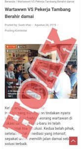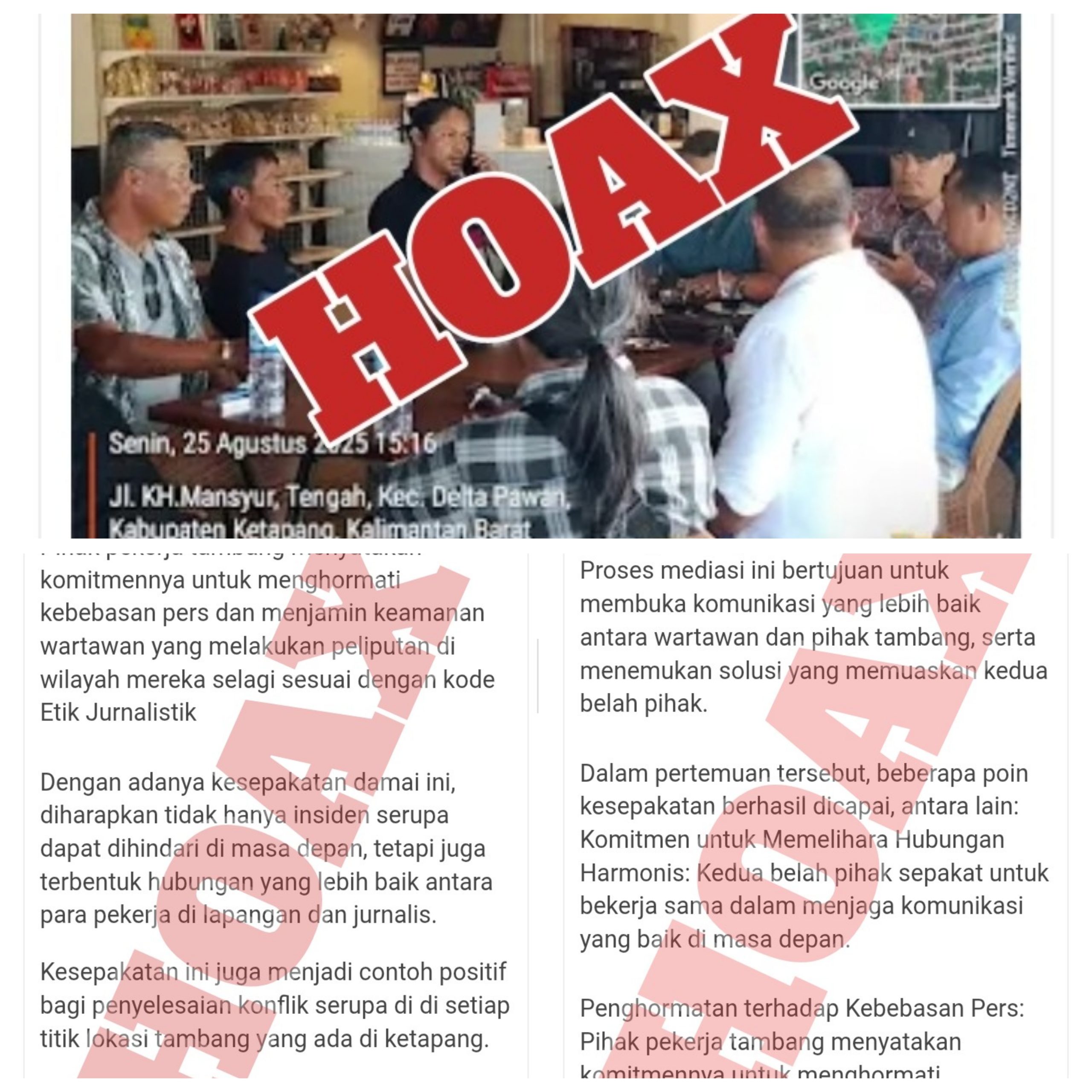 Ketapang, Kalbar – Beredar berita yang terbit di Media Online Indometro.id dengan judul Wartawan Vs Pekerja Tambang Berakhir Damai. Pemberitaan tersebut adalah sebuah informasi Hoax(pembohongan publik).