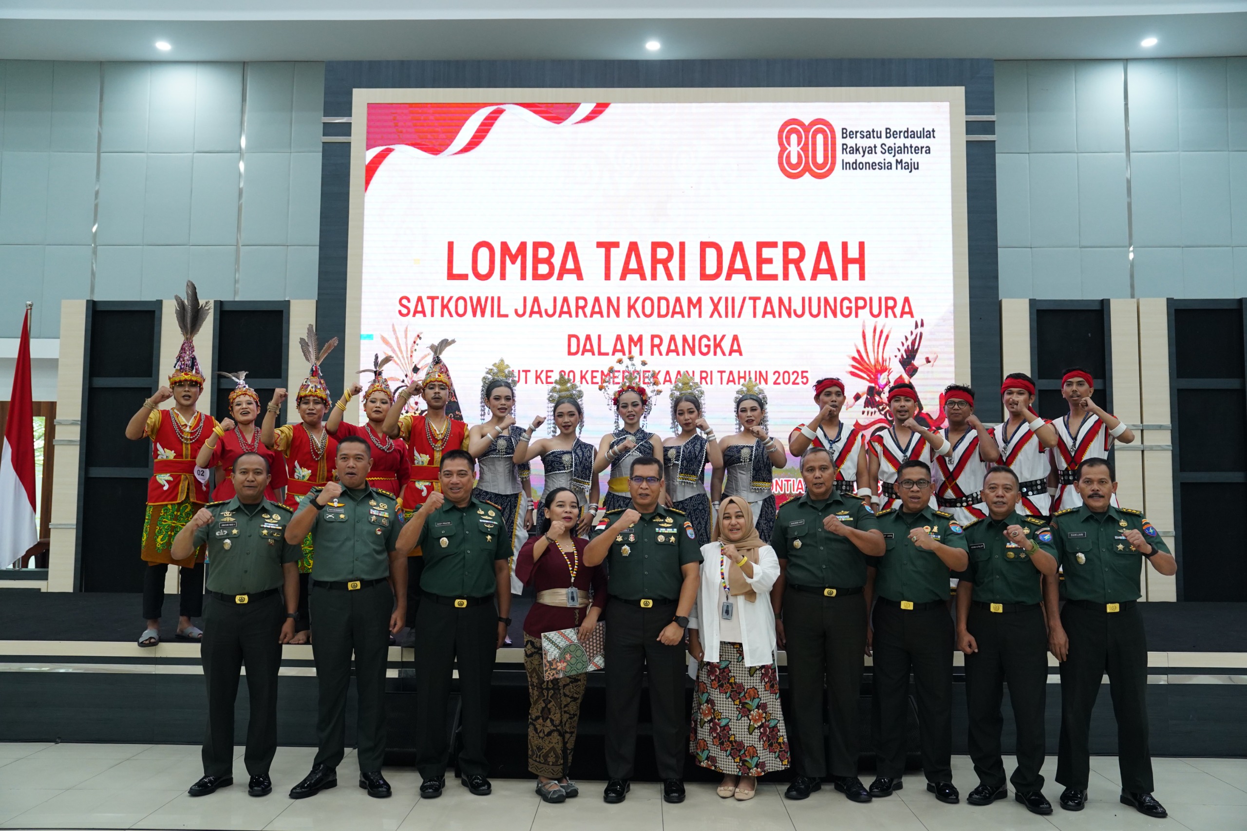 Kubu Raya – Dalam rangka memeriahkan Hari Ulang Tahun ke-80 Kemerdekaan Republik Indonesia, Kodam XII/Tpr menyelenggarakan berbagai pertandingan-pertandingan atau perlombaan. Salah satunya yang dilaksanakan pada hari ini lomba Tari Daerah antar satuan komando kewilayahan (Satkowil) jajaran Kodam XII/Tpr. Kegiatan ini bertujuan untuk memperkuat rasa cinta tanah air, melestarikan budaya nusantara, serta meningkatkan soliditas dan kreativitas.
