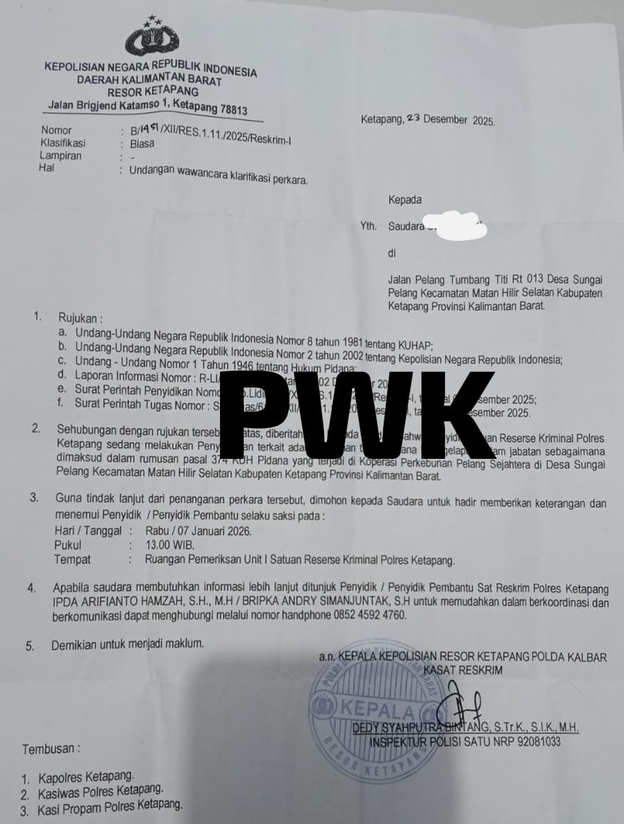 Penerimaan laporan tersebut tertuang dalam surat bernomor B/1451/XII/RED.1.11./2025/Reskrim-I. Saat ini, penyidik Satreskrim Polres Ketapang tengah melakukan penyelidikan guna mengungkap dugaan peristiwa pidana tersebut.