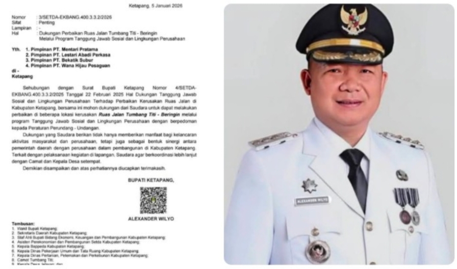 Ketapang,- kalbar Pemerintah Kabupaten Ketapang, melalui Bupati Alexander Wilyo, menerbitkan surat resmi nomor 3/SETDA-EKBANG.400.3.3.2/2026 tanggal 5 Januari 2026 yang mengajak empat perusahaan beroperasi di wilayah tersebut untuk berperan dalam perbaikan ruas jalan Tumbang Titi – Beringin melalui program Tanggung Jawab Sosial dan Lingkungan (TJSL/CSR).
