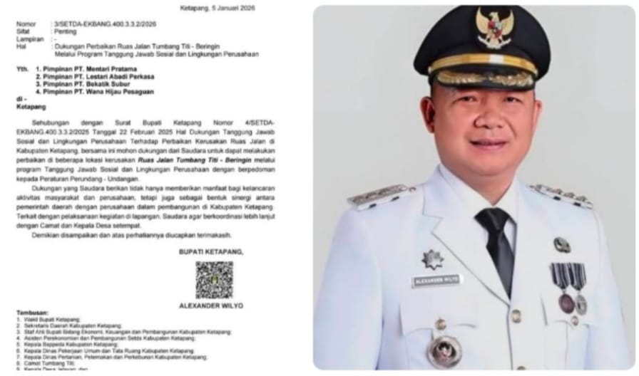 Ketapang,kalbar Pemerintah Kabupaten Ketapang, melalui Bupati Alexander Wilyo, menerbitkan surat resmi nomor 3/SETDA-EKBANG.400.3.3.2/2026 tanggal 5 Januari 2026 yang mengajak empat perusahaan beroperasi di wilayah tersebut untuk berperan dalam perbaikan ruas jalan Tumbang Titi – Beringin melalui program Tanggung Jawab Sosial dan Lingkungan (TJSL/CSR).
