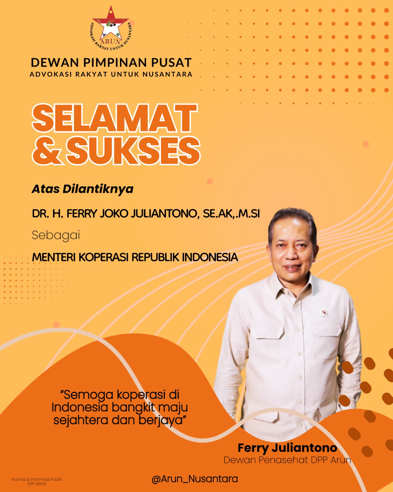 Ucapan selamat ini tidak hanya sebatas bentuk penghormatan, namun lebih kepada dukungan penuh dari ARUN Kalbar terhadap setiap langkah, kebijakan, dan program yang akan digagas oleh Bapak Menteri. Kami yakin, dengan pengalaman, dedikasi, serta komitmen beliau, koperasi Indonesia akan semakin kokoh sebagai pilar ekonomi kerakyatan yang mampu menghadirkan kesejahteraan merata bagi seluruh rakyat Indonesia.