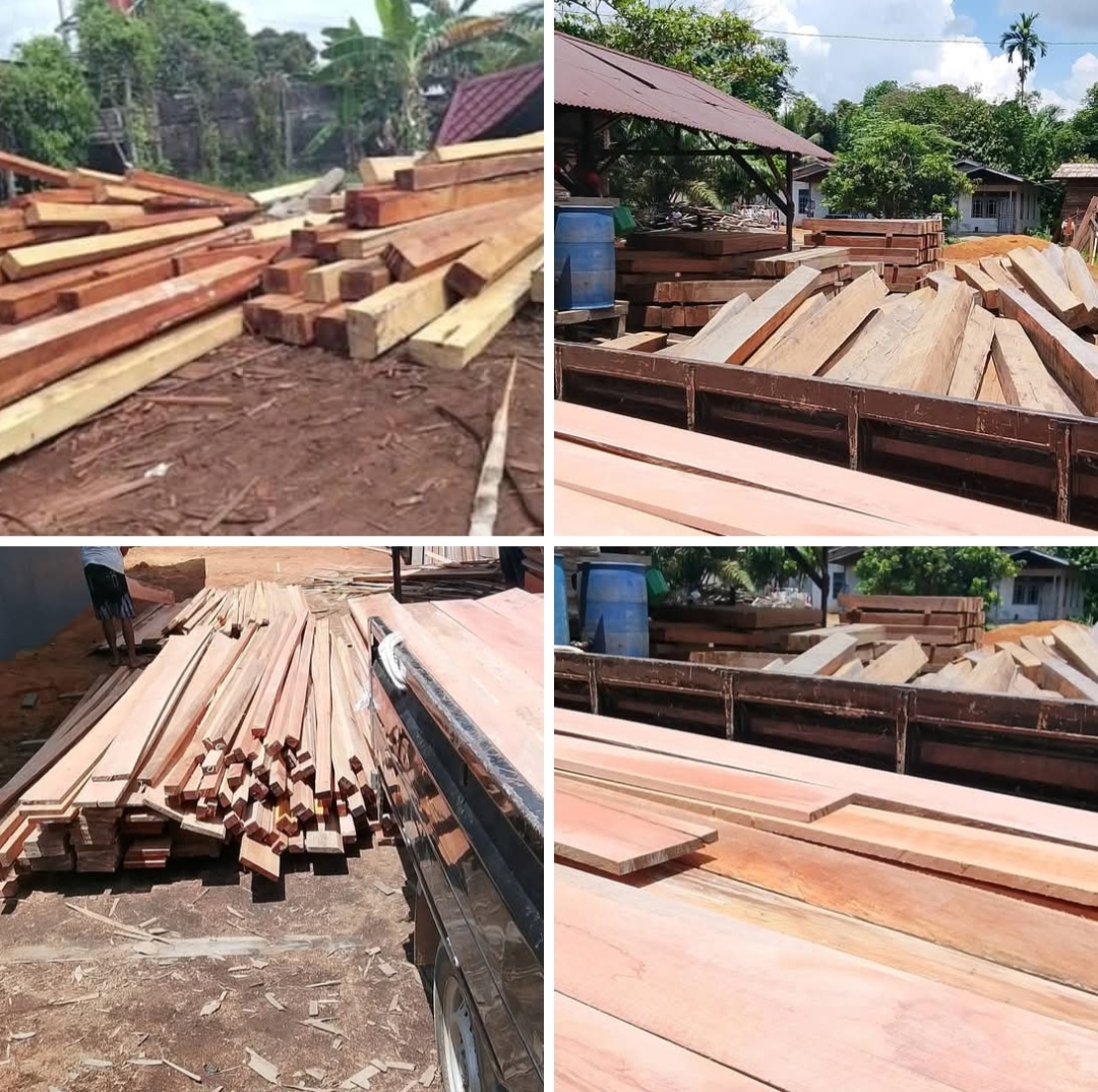 Unggahan yang diposting akun Facebook Power Pers memperlihatkan deretan kayu olahan dengan berbagai ukuran yang tersusun rapi di lahan terbuka. Yang mencurigakan, lokasi penimbunan tersebut berada tepat di belakang kediaman seseorang yang disebut dalam postingan bernama “Akau”. Tidak hanya kayu, di lokasi itu juga terlihat alat pemotong kayu jenis serkel, yang menandakan aktivitas pengolahan berlangsung di tempat tersebut.